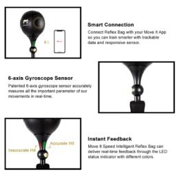 El puching ball lleva incorporado un sensor giroscópico de 6 ejes que recopila información sobre tus golpeos. Conectado por Bluetooth transmitirá directamente a tu smartphone datos sobre el consumo de calorías, intensidad, velocidad, precisión o número total de golpeos realizados.