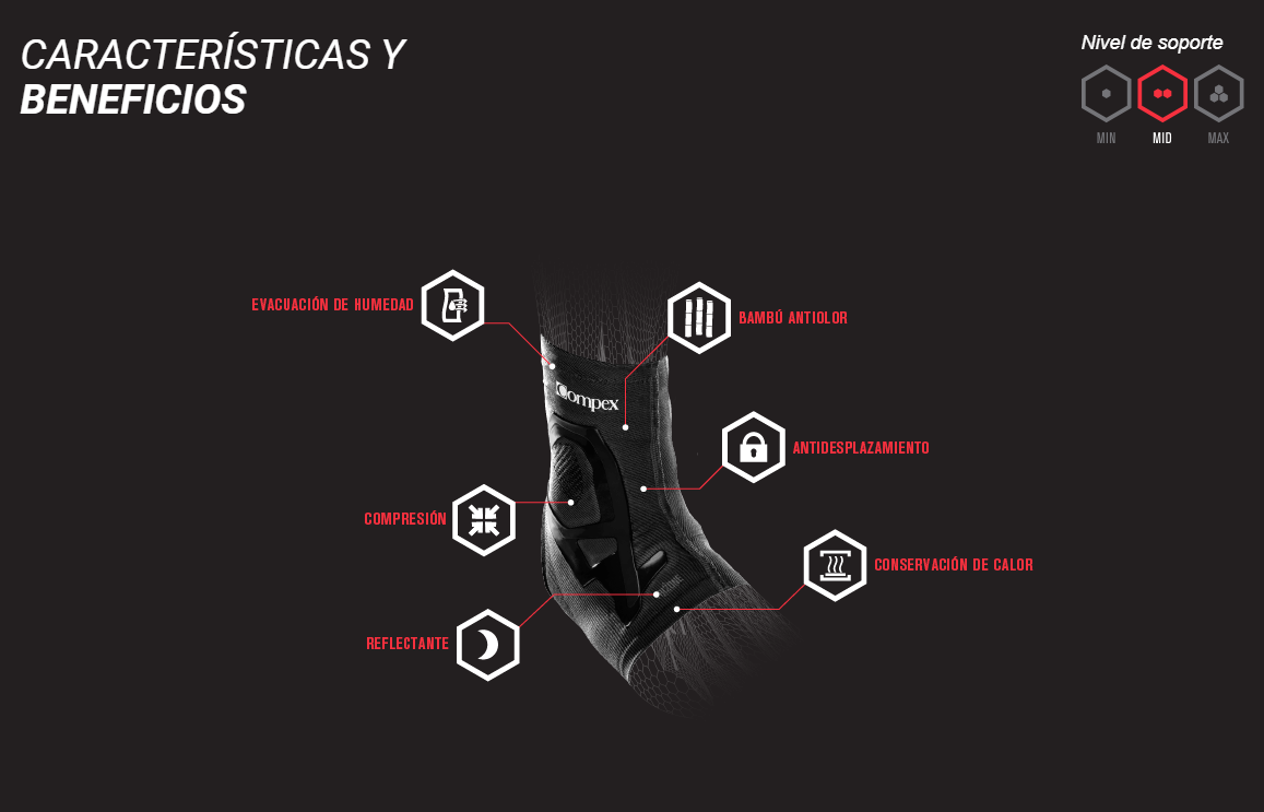 - Tres zonas de compresión estratégicamente colocadas alrededor del tobillo para asegurar el máximo rendimiento