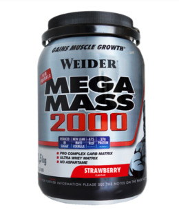 - 19% Proteínas: Principalmente proveniente de una mezcla de concentrado y de aislado de suero. Dada la importancia de la proteína en el desarrollo de la musculatura y los avances en la investigación de ingredientes, Mega Mass 2000 ha mejorado las fuentes de proteína, para conseguir un aminograma más completo. De esta manera, además de proporcionar nutrientes energéticos, facilita la regeneración y desarrollo muscular.