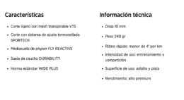 Upper elaborado con mesh técnico, muy ligero y transpirable gracias a la tecnología avanzada VTS, que mejora el confort y reduce la acumulación de calor dentro de las zapatillas. Asegura que el pie se mantenga fresco y cómodo durante todo tu entrenamiento o competición.
