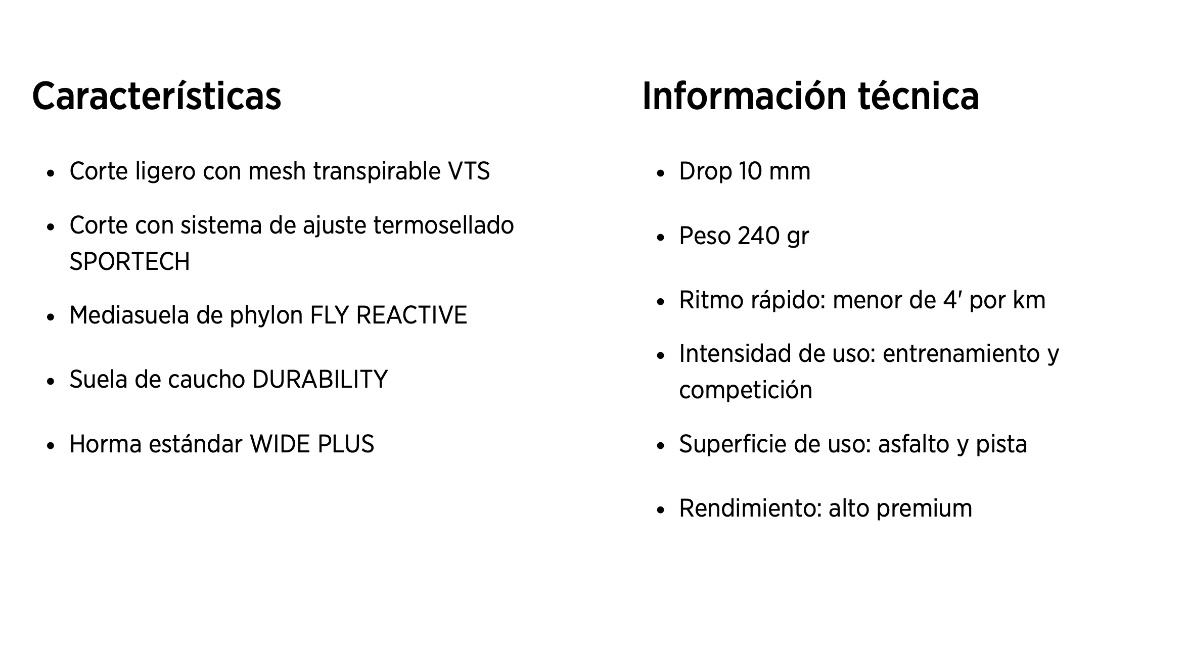 La mediasuela presenta un diseño reactivo con un drop de 10 mm y está compuesta por dos materiales. En la zona trasera, el FLY REACTIVE ofrece un alto retorno de energía y una propulsión eficaz, maximizando la eficiencia de cada zancada. En la parte delantera, un phylon de última generación aporta estabilidad. La combinación de ambos compuestos asegura una pisada suave y una respuesta dinámica, logrando el equilibrio ideal entre comodidad y rendimiento.