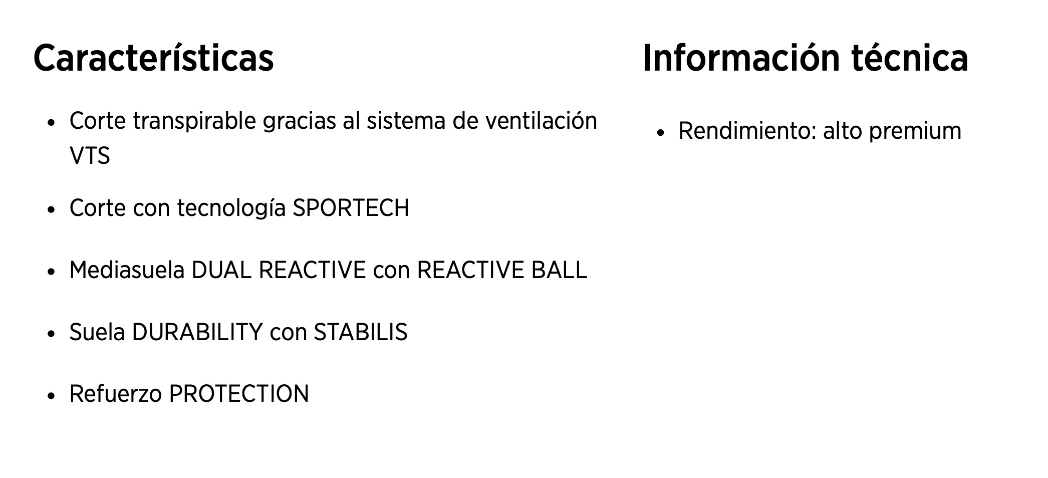 Mediasuela DUAL REACTIVE. El phylon superior proporciona un retorno de energía excepcional. El REACTIVE BALL inferior ofrece una amortiguación superior. Este diseño no solo brinda estabilidad en los movimientos laterales, fundamentales en el pádel, sino que también optimiza los arranques explosivos y los frenazos rápidos durante los cambios de dirección en la pista. Equipada con una pieza STABILIS en el medio pie para evitar torsiones y dar un soporte extra.