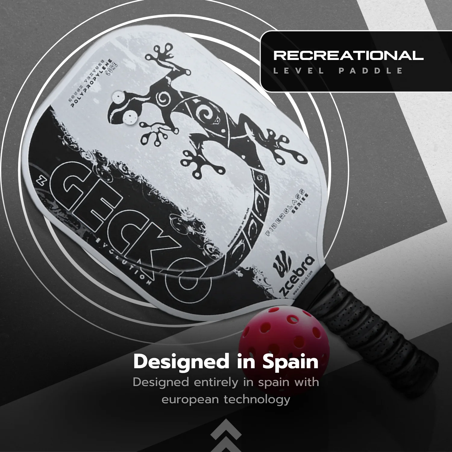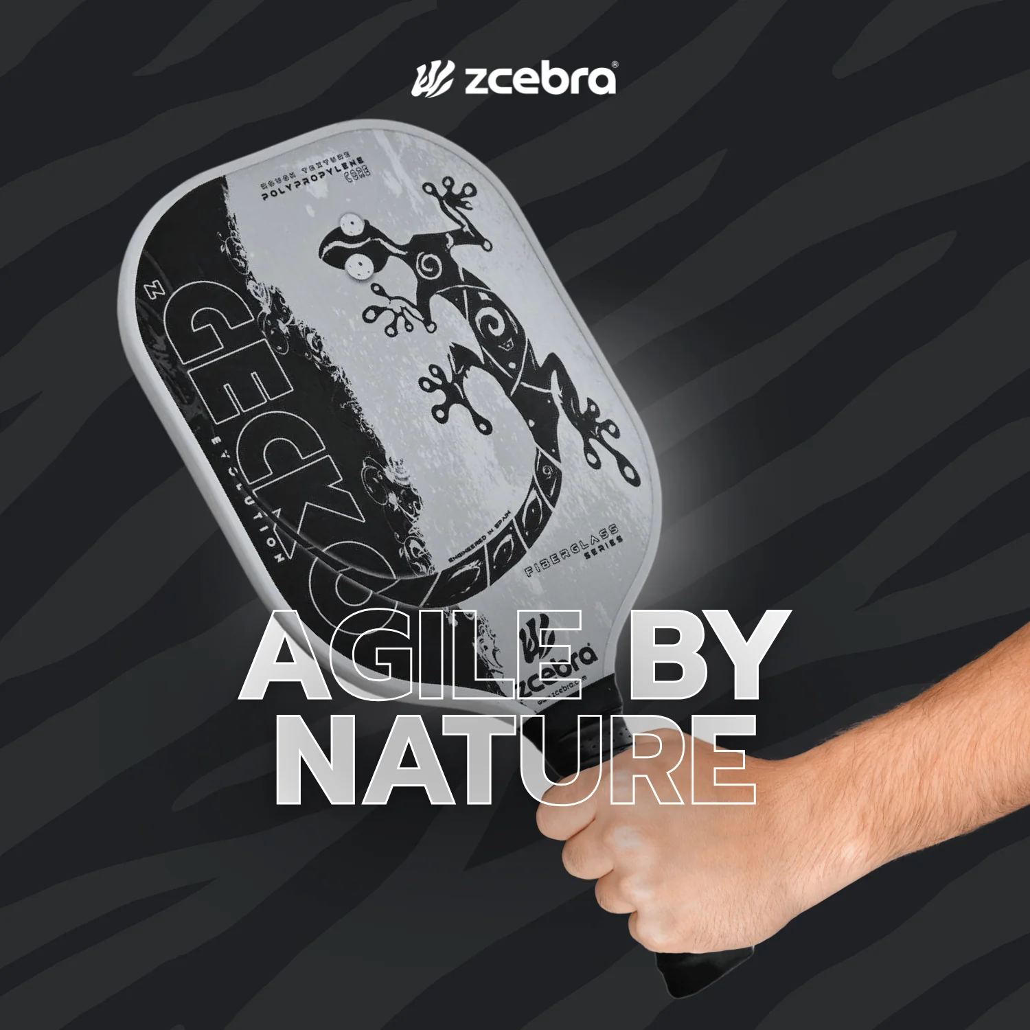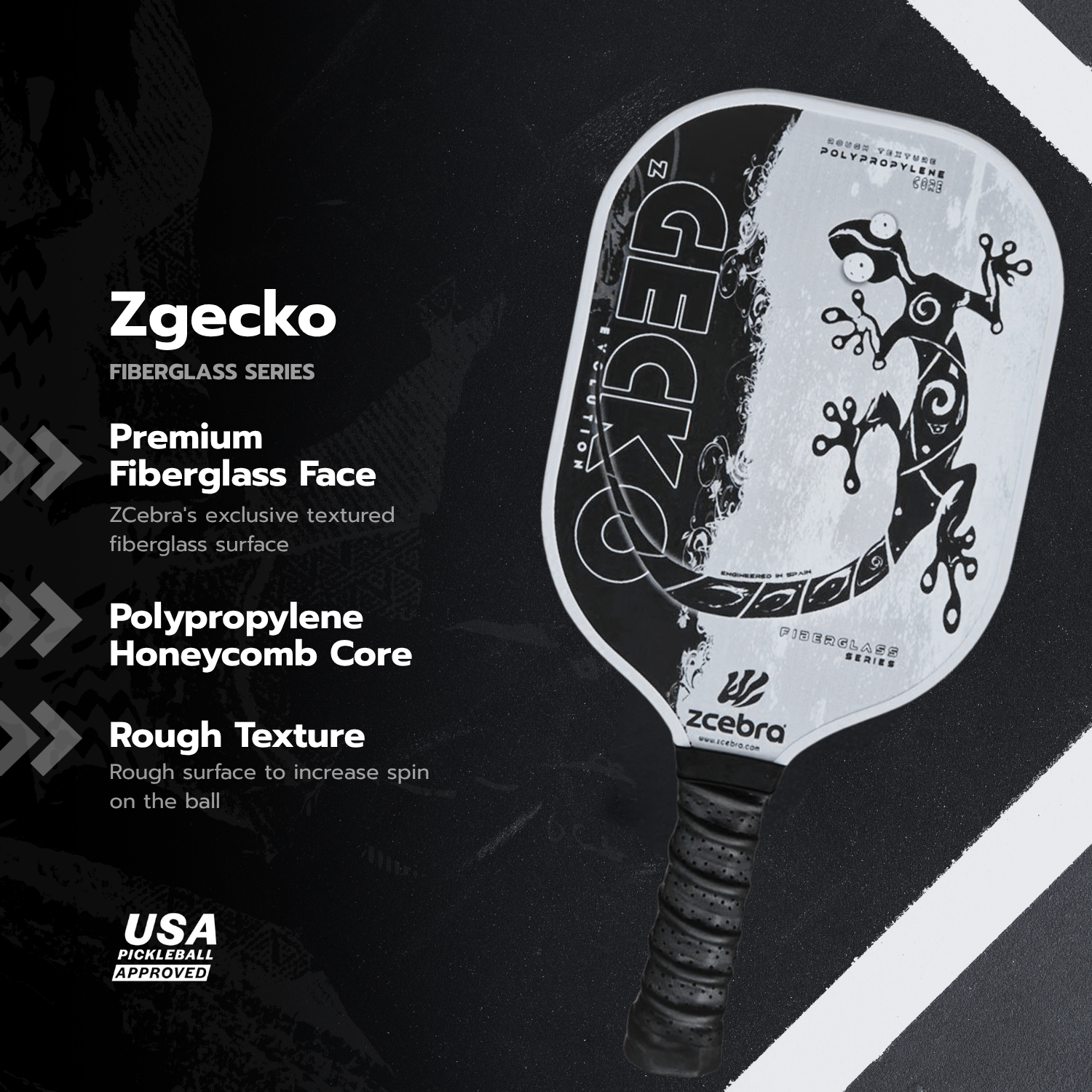 Posee un núcleo de 13 mm grosor, fabricado en Polipropileno de alta calidad en forma de panel de abeja. La Zgecko tiene una forma estándar dentro del mercado del Pickleball, adaptándose a todo tipo de juego, cara ancha y larga y mango alargado para poder ser utilizado a una o dos manos.