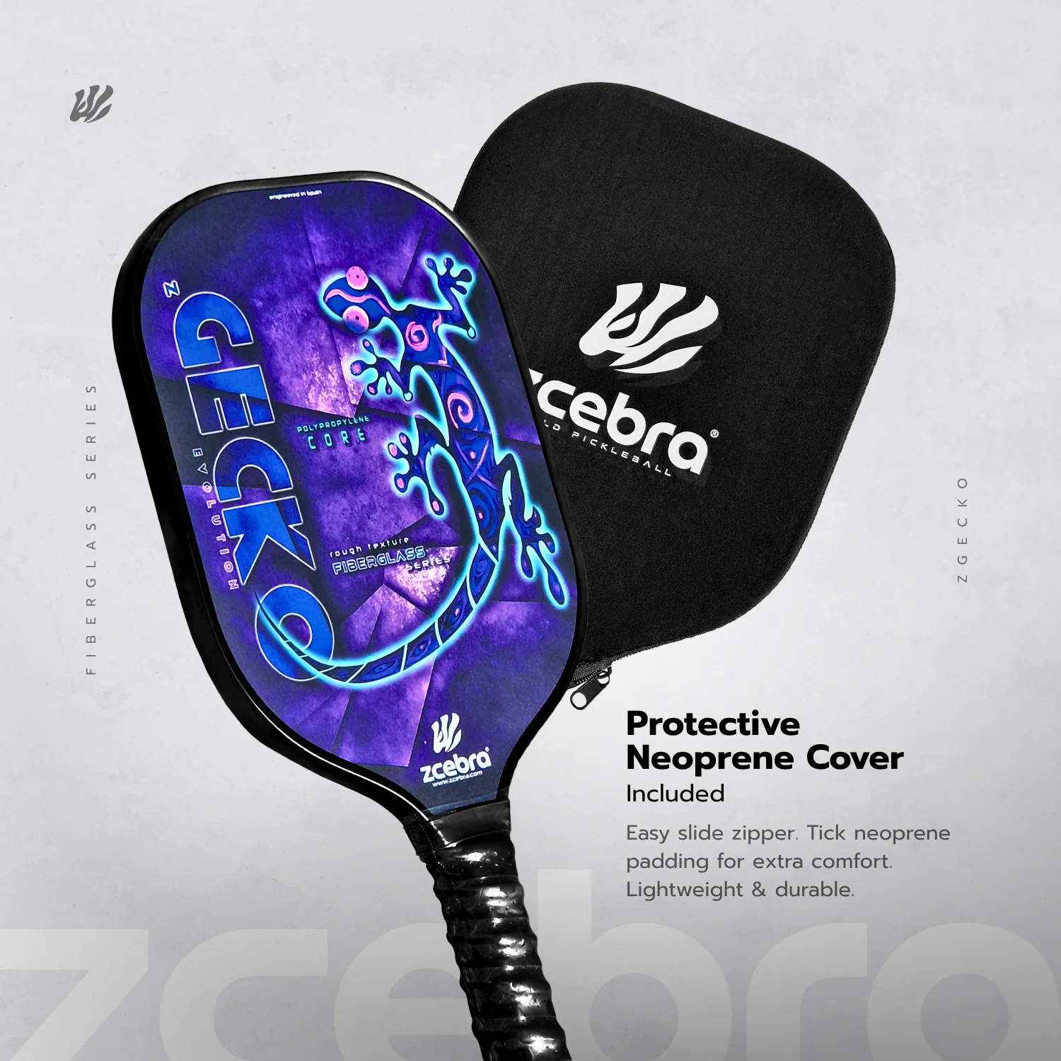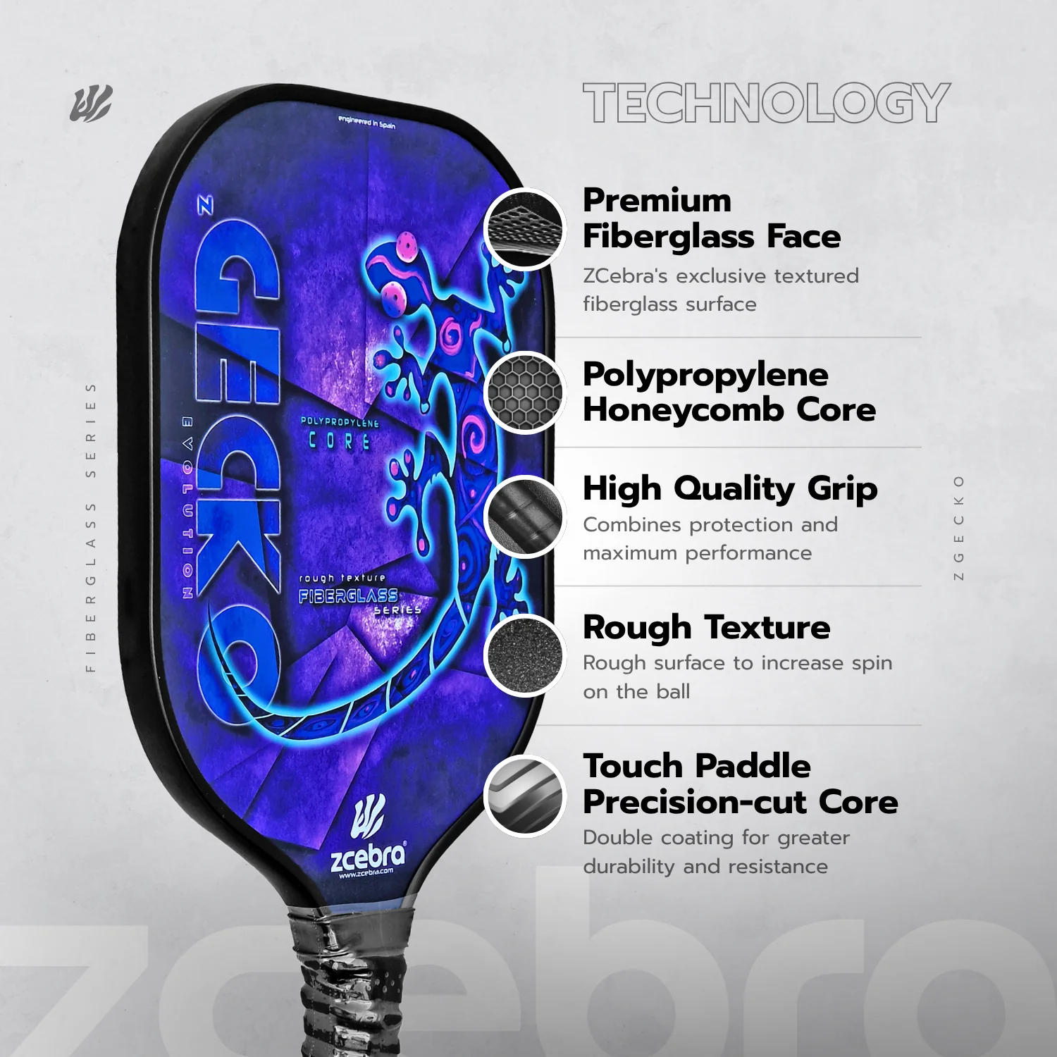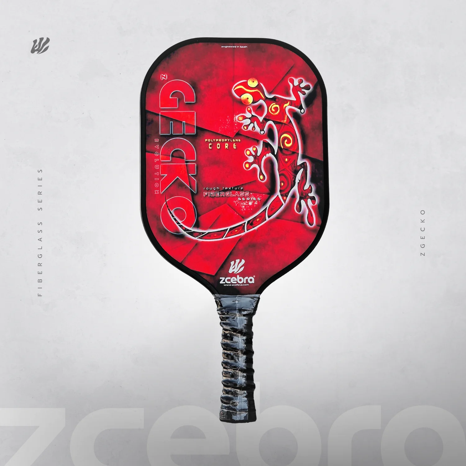 Posee un núcleo de 13 mm grosor, fabricado en Polipropileno de alta calidad en forma de panel de abeja. La Zgecko tiene una forma estándar dentro del mercado del Pickleball, adaptándose a todo tipo de juego, cara ancha y larga y mango alargado para poder ser utilizado a una o dos manos.